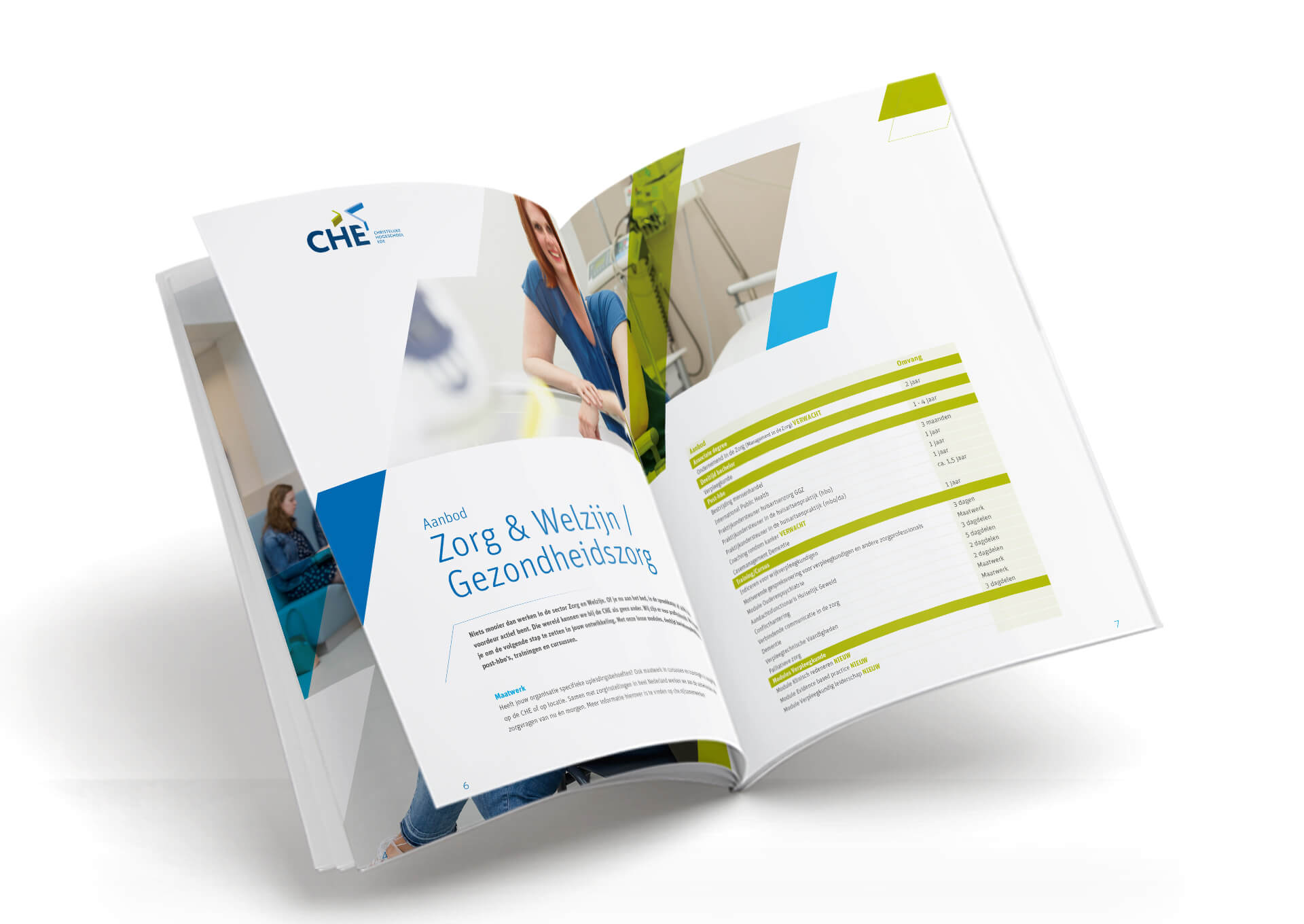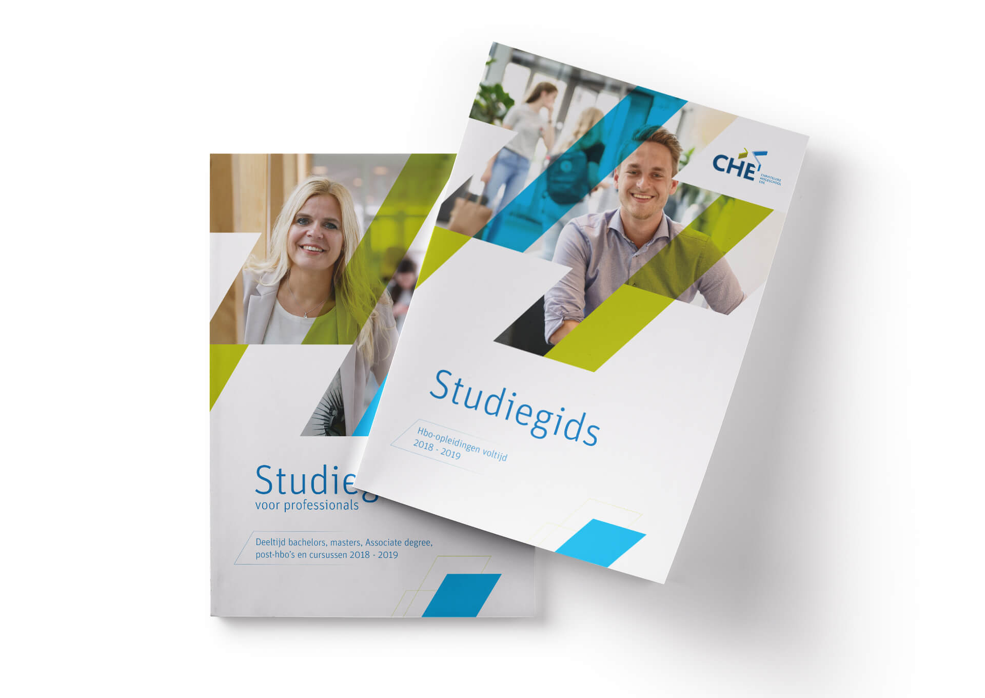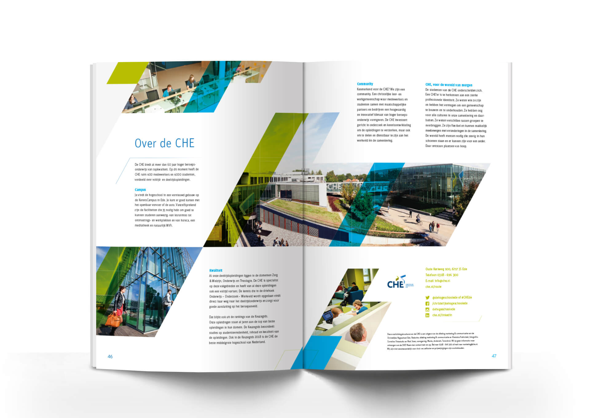 De CHE activeert nieuwe studenten met een simpele vraag: wie wil jij zijn voor de wereld van morgen? Het antwoord op die vraag vormt vaak een verhaal en geeft een gevoel van vooruitgang. De wereld van morgen is immers altijd in beweging. Dit gevoel kwam dan ook centraal te staan in onze designtaal. Een vloeiend lijnenspel dat altijd vooruit wil, aangevuld met frisse kleuren en een nieuwe fotografiestijl die eigenheid uitstraalt. Deze nieuwe designtaal is vervolgens doorgevoerd in alle mogelijke communicatie-uitingen van de hogeschool.